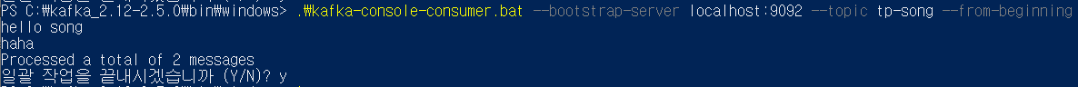.\kafka-console-consumer.bat --bootstrap-server localhost:9092 --topic [토픽명] --from-beginning