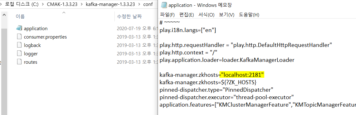 다음 경로에 있는 application.conf 파일의 kafka-manager.zkhosts를 수정한다.