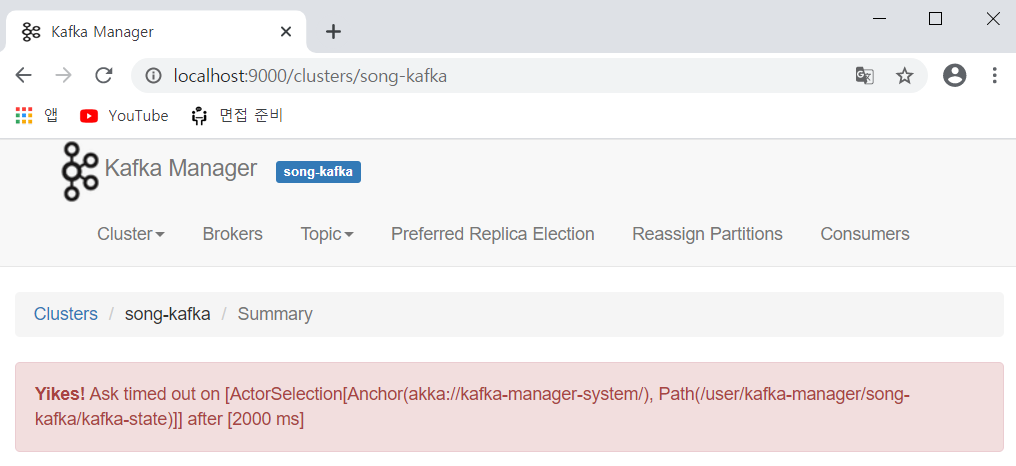 Yikes! Ask timed out on [ActorSelection[Anchor(akka://kafka-manager-system/), Path(/user/kafka-manager/song-kafka/kafka-state)]] after [2000 ms]