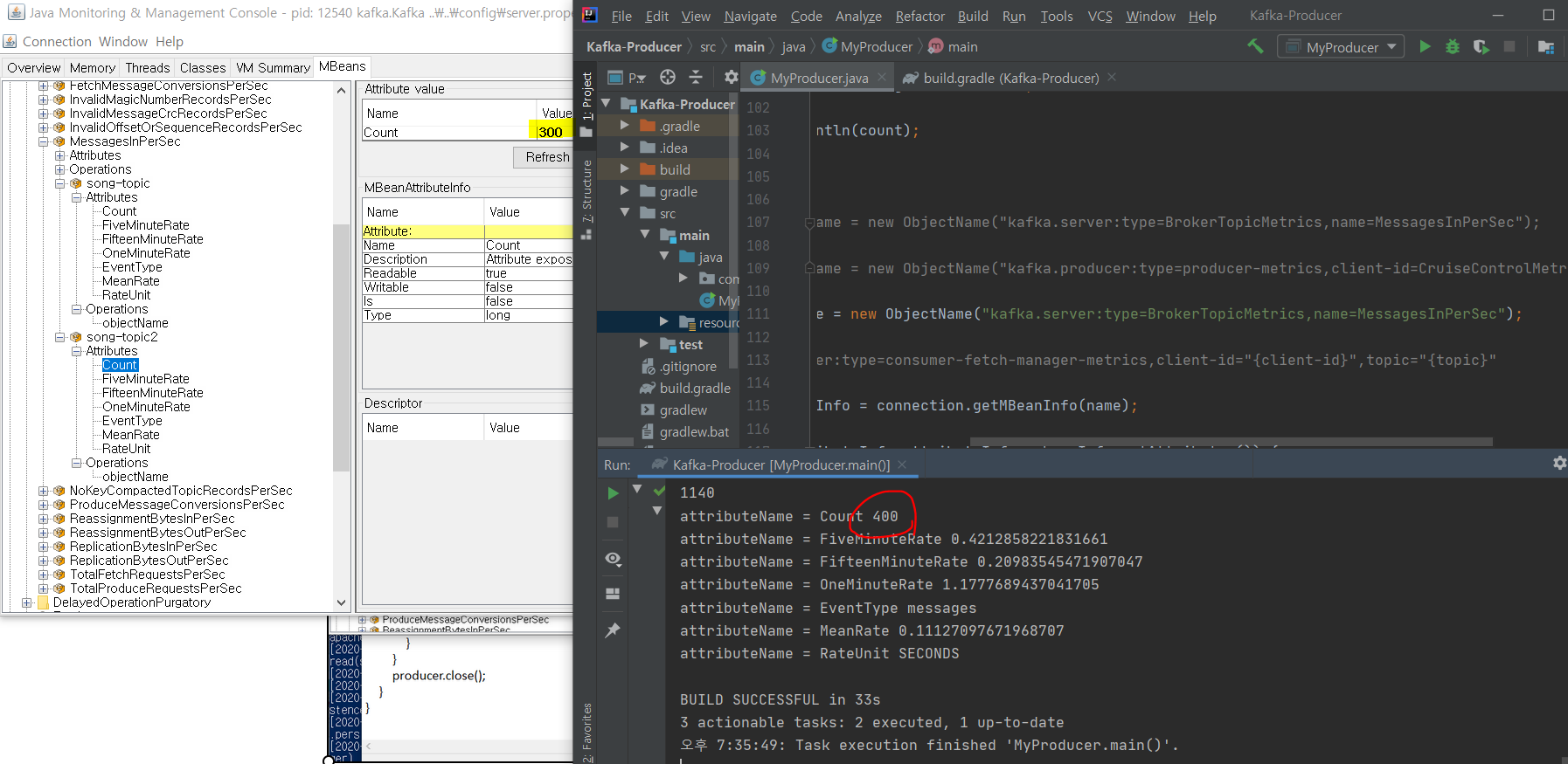 그리고 프로그램으로 메트릭 결과를 가져온 결과, song-topic의 메시지 수 100 + song-topic2의 메시지 수 300개의 합을 볼 수 있다.