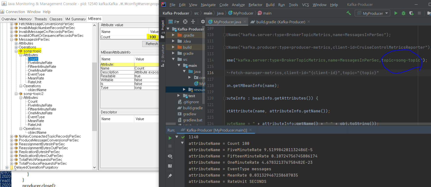 테스트를 위해 프로듀서를 생성하여 생성한 토픽(song-topic)으로 100개의 메시지를 보내는 프로그램을 실행하고,