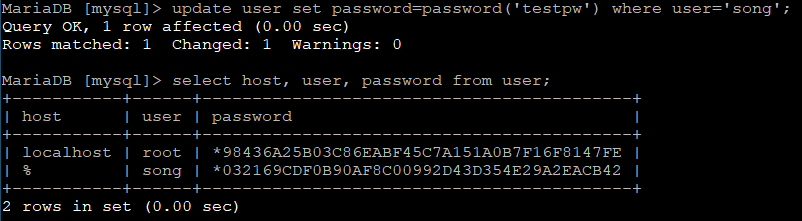 update user set password=password('비밀번호') where user='계정명';