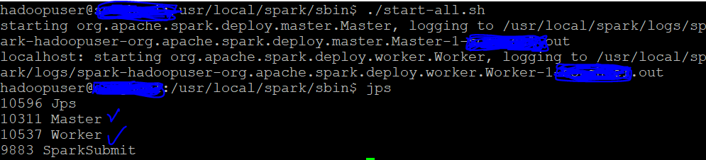 hadoopuser@--:/usr/local/spark/bin$ hadoop fs -cat /user/--/wordCount/part-00000