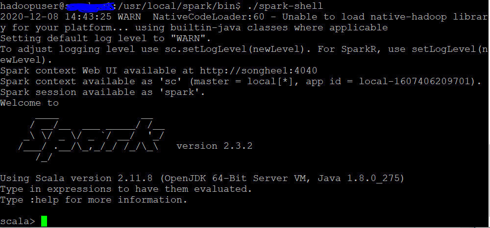 hadoopuser@--:/usr/local/spark/bin$ ./spark-shell