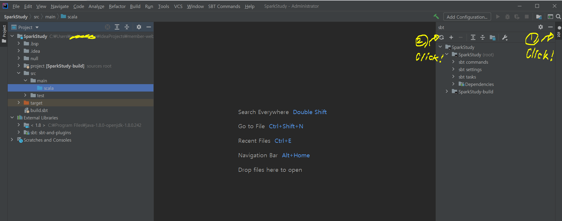 IntelliJ 화면 우측에 sbt를 누르면 새로운 창이 하나 열린다.