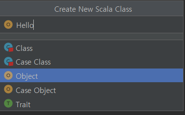[프로젝트] - [src] - [main] - scala 에서 오른쪽 버튼을 클릭하고 Scala Class를 선택하여 생성한다.