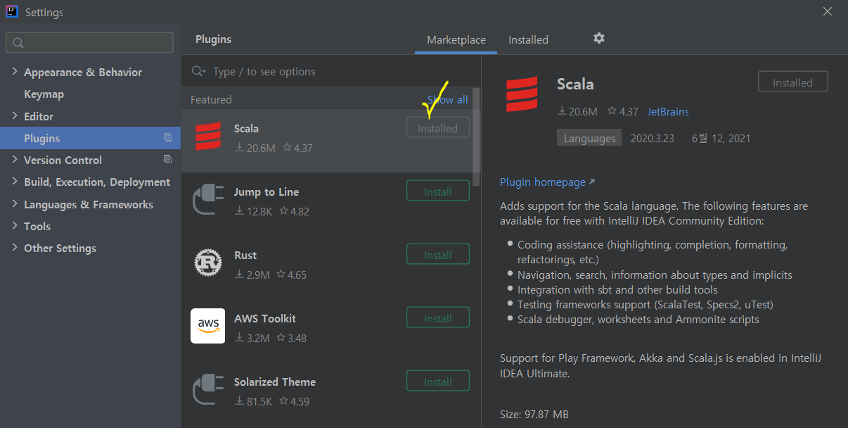 scala를 검색하고 설치해줍니다. 설치 이후 인텔리제이를 재시작합니다.