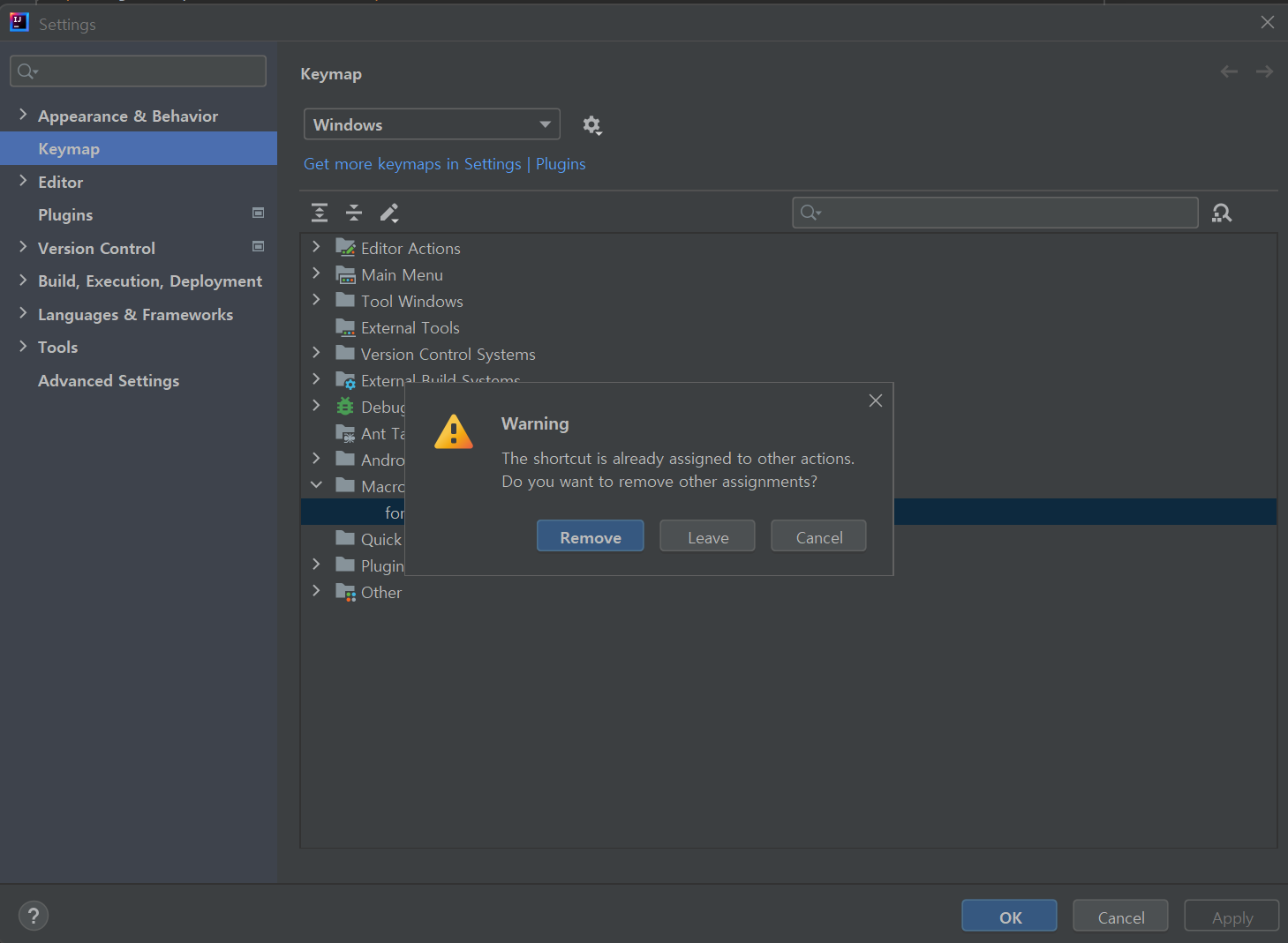 File-Settings-Keymap-Macros에서 등록한 macro를 선택한다.
