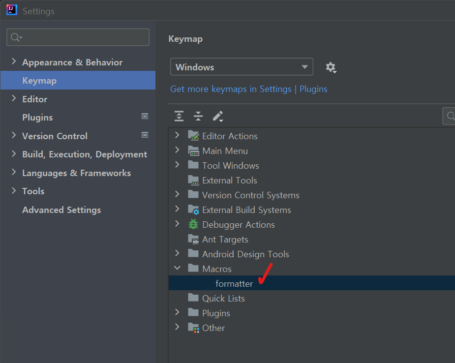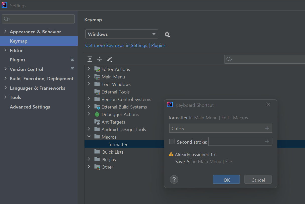 이제 ShortCut으로 등록해서, Save(Ctrl+s) 할 때 마다 formatter가 자동 적용되도록 매크로를 등록하자.