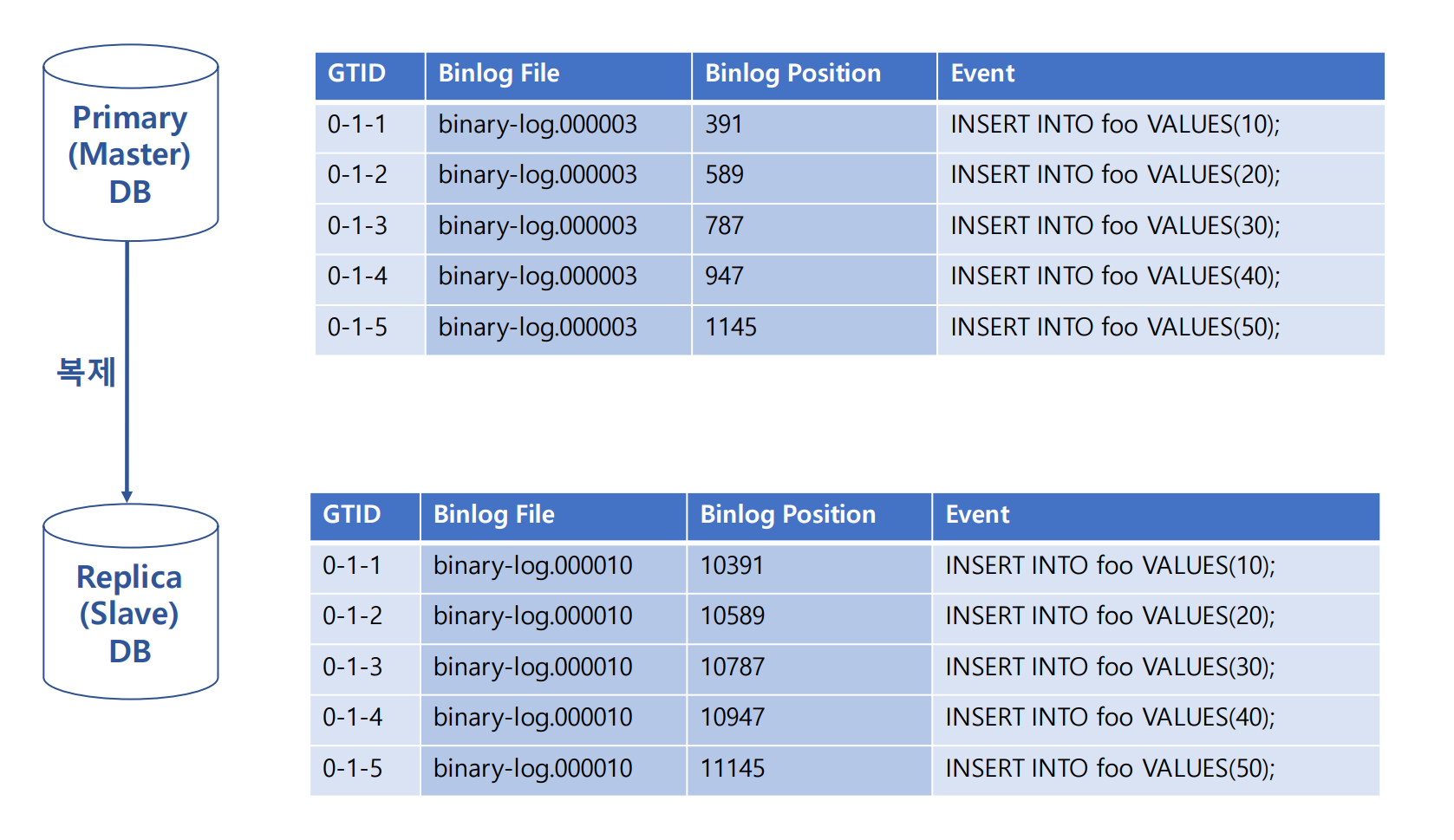 Replica(Slave, 이하 R)서버는 biglog events를 읽고, Primary(Master, 이하 P)와 같은 변경사항을 R에 적용한다.