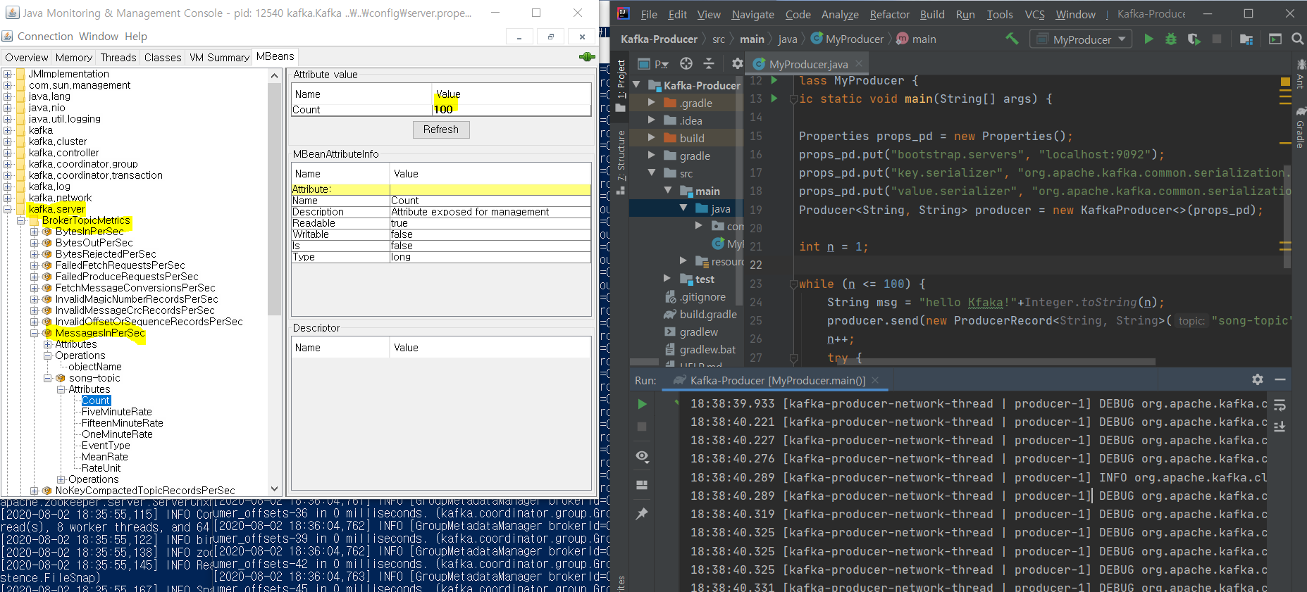 아파치 카프카의 도큐먼트에 따라 Jconsole을 이용하여 해당 브로커가 관리하는 토픽에 유입되는 메시지 수를 파악할 수 있다. InPerSec라고 해서 초당 메시지 수라고 생각했으나, 초당이 아닌 전체 메시지 수를 확인할 수 있다. 테스트를 위해 프로듀서를 생성하여 생성한 토픽(song-topic)으로 100개의 메시지를 보내는 프로그램을 실행하고, 이를 Jconsole에서 확인하였다. kafka.apache.org/090/documentation.html#monitoring Apache Kafka Apache Kafka: A Distributed Streaming Platform. kafka.apache.org 해당 브로커로 유입되는 초당 메시지 수를 확인하고, 토픽별로 확인을 할 수 있는지 다시 테..