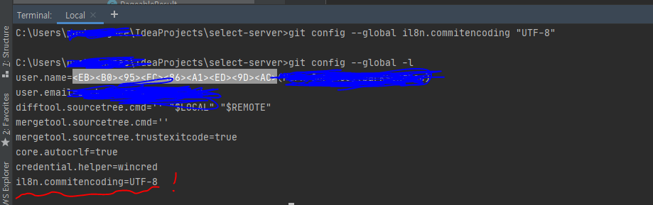 IntelliJ commit 메시지 한글 깨짐 commit할 때 마다 나를 화나게 하는 한글 깨짐.. 그리고 git에도 다 깨져서 올라간다. IntelliJ한글깨짐으로 검색해서 setting값도 바꿔보고, idea64,exe 에 아래 처럼 추가도 해보고, 했지만 전혀 소용이 없었다. 이상하게 commit하려고만 하면 한글이 다 깨진다. -Dfile.encoding=UTF -Dconsole.encoding=UTF-8 드디어 찾아냈다. 1. git config --global -l 설정 추가 인텔리제이를 열고, 터미널 창으로 넘겨서 아래와 같이 쳐보자. >git config --global -l 뭔가 나올 것이다. 그 다음은 이걸 쳐보자. >git config --global il8n.commitencodi..